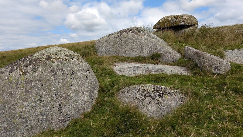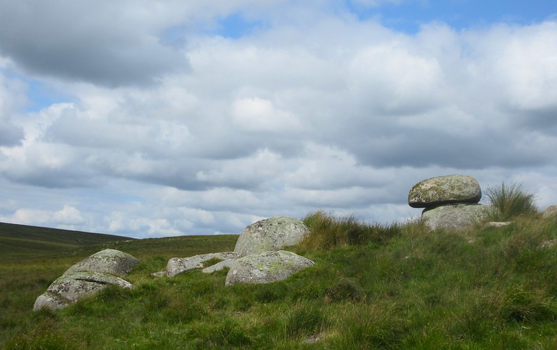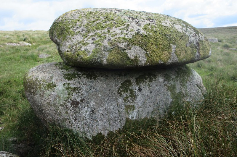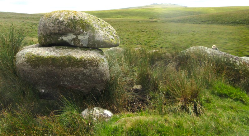 ![]() This charming, albeit small but distinctive cluster of large rocks, can be found in a rather remote spot on the eastern side of the River Walkham at about a mile or so to the south of its source. In an area otherwise devoid of granite it presents as a miniature tor when viewed from the south. Its best aspect is the curious rounded rock that rests on another forming a tiny stack that reaches about 2 metres in height amid several other large boulders lying flat in the grass. It is thought that Eric Hemery (1983) mentions the site in the tome High Dartmoor - Land and People where on page 1040 he states on a descent of the river 'On the opposite bank are some scattered rocks (below Sandy Ford)' but it cannot be confirmed that this is what he actually saw. ![]() Since then the name of Walkham Rocks surfaced in the early 1990s and is widely accredited to the Dartmoor Letterboxing fraternity with several stamps and clues bearing that name sited off the rocks in question. This has been confirmed by two independent Letterboxers of that time John Deakins (aka Rover John) and Tim Jenkinson (aka Dartmoor Poet) who remember that name. The Rocks here provide a great place to rest awhile and enjoy the views that are dominated to the south west by the giant massif of Great Mis Tor. To the north of the Rocks the visitor is reminded of the utter bleakness of the northern moor looking towards the head of the river and the aforementioned Sandy Ford. ![]() Another point of interest is that the Dartmoor Prison Leat now disused and mostly dry runs close by, descending from its take off point in Spriddle Lake. It was constructed by French Prisoners of War in the early 19th Century. This account appears on the Heritage Gateway: 'Prison Leat running from SX 574795 (at the River Walkham) to SX 584741 near to the prison in Princetown, a distance of 6.5 kilometres. The leat was built between 1806-09 to supply the war prison and soldiers' barracks. It was maintained until the 1990s, when South West Water took over responsibility for the water supply.' ![]() Given its isolated location Walkham Rocks feels like a place that is rarely visited and is most certainly off most of the beaten tracks of Dartmoor. This alone makes it a must see little rockpile.