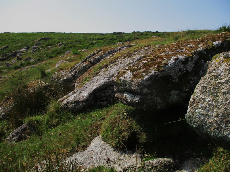Not far from Chittaford Down Rocks (CDR) lies another cluster of less impressive boulders that straddle a small feeder stream leading downhill from the wide desolate pan of Archerton Bog to the west. The best part of this small emerging tor is its peculiar low flat outcrop on the north side that is weirdly divided into five distinct segments.