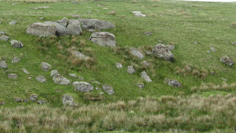 This collection of large boulders is a tale of mistaken identity by Eric Hemery. In High Dartmoor, he describes the location of Black Rocks on his journey from Phillpott's Cave; "Further downstream, on the west side of the valley and almost on its floor, is the unremarkable, humble tor known as Black Rocks (approx. 1,370 feet)... The rocks, although in themselves large, form only a tiny tor - and the only one in this lonely valley..."