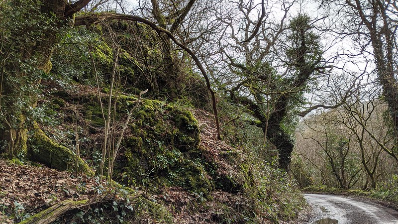 ![]() About 500 metres to the south-south-east of Clifford Bridge can be found a huge, vegetation-covered rock face on a sharp bend in the road as it continues its route eastward to the hamlet of Boyland and the village of Dunsford. The rock type here is, like all of the other exposed rock faces in this area, metamorphic and is often known as 'bad rock' on account of its apparent lack of usefulness as a building material since it is so easy to erode and crumble away. ![]() The lowest crag is literally on the edge of the road and presents as a large mass of rock stretching further up the hill into private land, mostly decorated in moss with trees sprouting out of the rocks, all of which are contained within plot 221 that is marked as 'Commons' on Tithe Maps, hence the name. ![]() Viewing the area from the east on the neighbouring hillside, called 'Boyland Down', which is represented as a viewpoint on information boards below, one will notice that the Crags continue the ascent up the precarious hillside with another exposed section of rock seen high above the stream before it passes under the road to reach the River Teign. ![]()