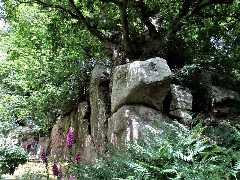 ![]() This is a stupendous tor sited in the National Trust's 'Whiddon Deer Park', renowned for its excellent bluebell display in spring. The upper rocks of this tor at SX 7260 8906 form a modest compact outcrop beside a track in the top half of the Deer Park, a mere 50 metres south of the conspicuous granite hut in the field that could be a linhay. Just within the woodland, the granite is adorned by moss and is noticeably quite pale, and when climbing atop these rocks you may spot two mossy rock basins that Paul Buck and Tim Jenkinson espied in June 2020. ![]() Whilst the track takes on a gentler descent on the hillside directly below the summit rocks, there is a breathtaking cliff of granite at SX 7250 8901, featuring many other smaller but equally impressive crags and stacks. It is seen from the same track below near the lane past Parford in winter and, when seen close-up, the main portion is quite menacing and, like most valley side tors, is best seen from below. Its towering masses amid the sparse tree cover here enables the visitor to clamber up to the top to take in the good vista out towards Meldon Hill and Kestor Rock. That said, it would be easier to walk to this point from the upper rocks already described to avoid the worst of the uneven terrain. ![]() Also at the top of the lower pile, you will notice two more rock basins, one a deep channel and the other a small, rounded example part tucked under a poised boulder that holds rainwater. Along with the summit rocks above, this is an awesome sprawling rock field on the hillside, but be warned this area is concealed in bracken during summer months and due to the nature of the terrain can be dangerous to traverse without the correct footwear. ![]()