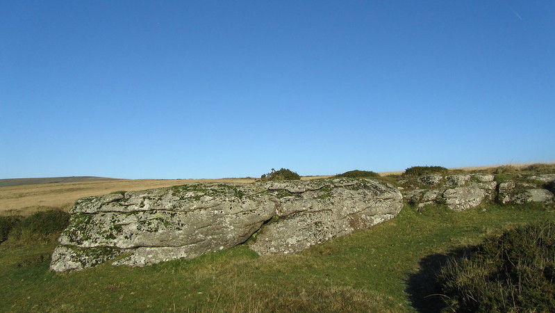![]() The name of this lowly tor was first noted in the winter edition of Dartmoor Magazine in 1991, secreted in an article by Hermon French entitled 'Christmas on Dartmoor 1930', when recounting his ornithological exploits on the moor at the time, he remarks on a raven flying to the north east that "came down low by Langworthy Tor and beat around the hill towards Wooder." The tor he refers to is probably set on the hillside to the east of Langworthy Farm, but it is of no great stature. On the western slope here, that still forms part of Hamel Down, there is a scattering of a few large, but mostly low-lying rocks all of which are little more than a metre high. ![]() Langworthy Hill itself culminates in a series of sparse rocks lying close to what appears to be a ruined cairn with a hollowed-out centre. A little way south of the summit there is a little more interest where a huge slab of bedrock is embedded in the turf being somewhat reminiscent of Stoneslade Tor much further to the north. ![]() However, the most significant rock in the vicinity actually lies another 200 metres to the south forming a singular compact flat-topped outcrop encircled by gorse, it measures some 10.5 metres in length and is at least 1.5 metres high on the west side. It is included in an account of the tors and rocks of Hamel Down by Tim Jenkinson from 1999 and writing later Ringwood (2013) enthuses "The tor has huge slabs with xenoliths and very large feldspar crystals." From here, on a clear day the views are exceptional, the distant crags of Longaford and Higher White Tors can be seen to the west and further north the white painted Warren House Inn is backed against the hump of Water Hill. ![]()