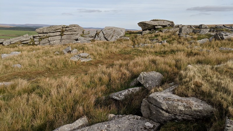 Rundlestone TorRundle Stone Tor, Stone Tor, Rendlestone Tor, Rendle Stone Tor ![]() On the northern slopes of North Hessary Tor one may miss Rundlestone Tor, which, for its location, lacks prominence from most directions but has some interesting granite outcrops and views to see. Best access is from the small car park west of the hamlet of Rundlestone on the B3357 road. ![]() Hemery describes it; "In ascending the hill, the road passes by the rock-piles of Rundlestone Tor (1,600 feet) on the Forest boundary. The east pile, large and spread-eagled, has two rock-basins on its mighty summit slab; that these have formed since the rock tilted is shown by the floor-angle of each: the floor diameter of the larger is two feet." ![]() Marked on the Tithe Map for the Parish of Walkhampton as "Stone Tor", Hemery inexplicably uses this appellation as an alternative name for nearby Hollow Tor. This outcrop, however, is marked separately on the same map where there is clear distinction between them. The nearest Parish, Lydford (Forest of Dartmoor), reveals little information. ![]()