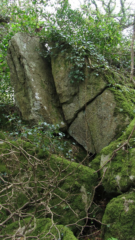 Whilst the footbridge is no longer in evidence what appears to be the Rock in question can still be reached via a footpath that leads through that part marked as 'Woodash' on OS maps. Now almost entirely shrouded in vegetation the Rock stands about 50 metres above the track and rises to around 4 metres in height on its east side.